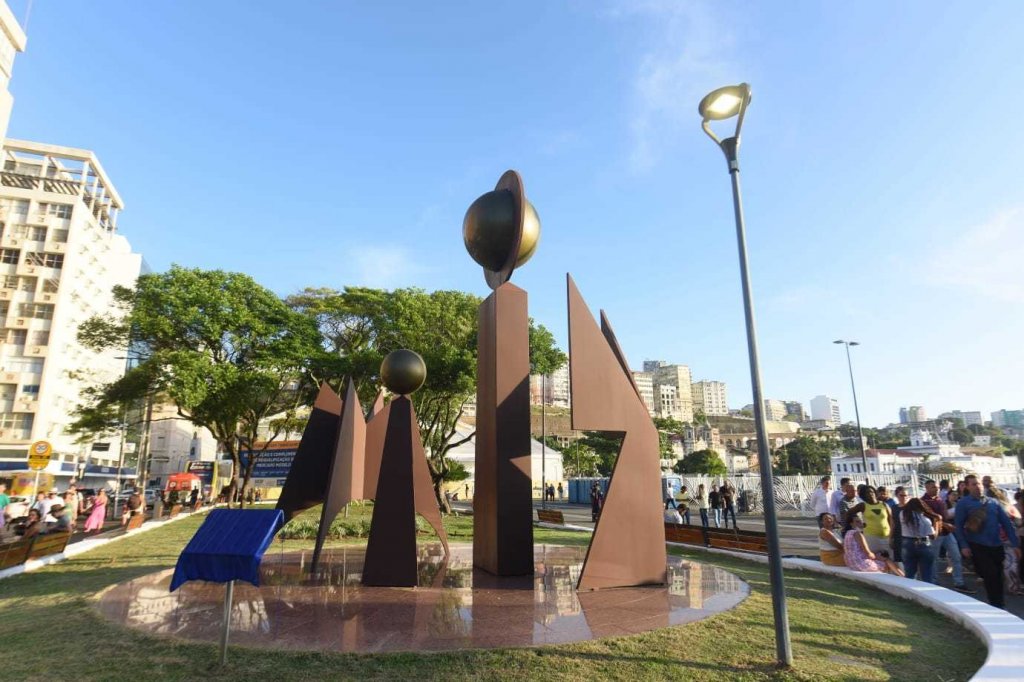 O Monumento à Cidade de Salvador, também chamado de Fonte da Rampa do Mercado, voltou a ocupar nesta quarta-feira (11/1) o mesmo lugar de origem após ser reconstruído em função de um incêndio que atingiu a peça original, em 2019. A obra de Mário Cravo Jr foi substituída por uma nova, feita com um material que não permite chamas.