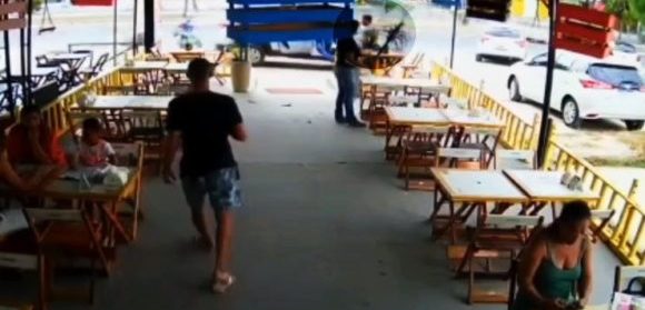 As pessoas que estavam no restaurante no momento do crime correram assustadas. A imagem da câmera ainda mostra quando uma mulher que estava com uma criança na mesa, puxa a menor pela roupa, para que elas deixassem o local.