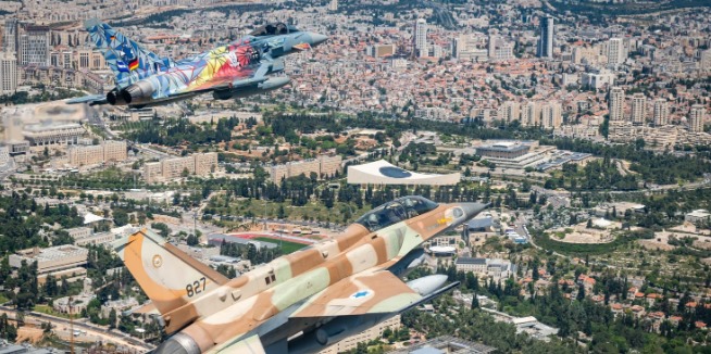 O sobrevoo, que aconteceu na quarta-feira, 26 de abril, foi organizado pela Força Aérea Alemã em parceria com a Força Aérea de Israel. Os jatos, adornados com um esquema de pintura especial com a Estrela de David e as cores da bandeira de Israel, realizaram uma série de sobrevoos sobre as duas cidades.