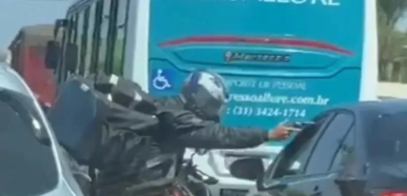 Vídeo que circula nas redes sociais mostra momento em que um motociclista disfarçado de entregador tenta assaltar um motorista de aplicativo, de 55 anos, nas imediações das avenidas Waldomiro Lobo e Cristiano Machado, na Região Norte de Belo Horizonte (MG), na última sexta-feira, 22. Quando percebeu que a vítima não tinha nada de valor, sacou a arma e tentou atirar, mas a arma falhou.