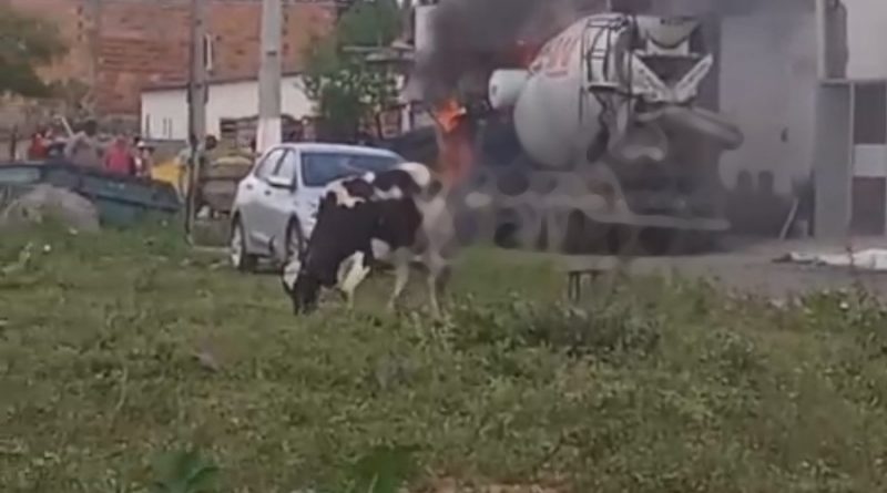 Cruz das Almas: Caminhão betoneira é consumido por incêndio no Loteamento Planalto.