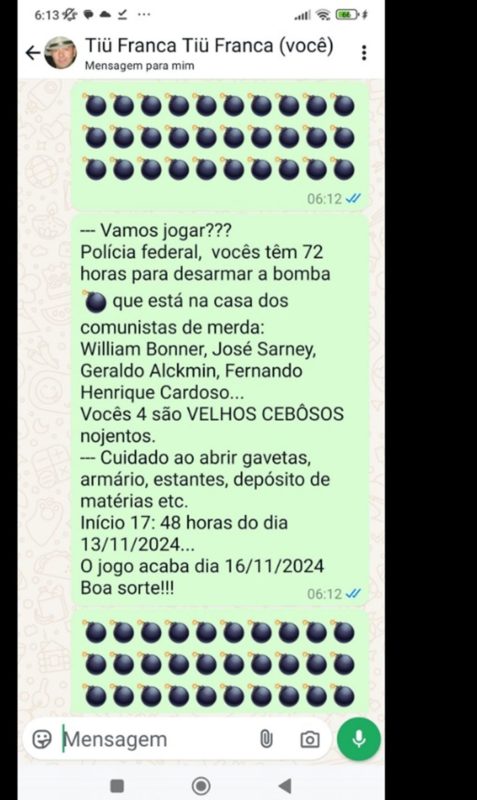 “VAMOS JOGAR??? POLÍCIA FEDERAL, VOCÊS TÊM 72 HORAS PARA DESARMAR A BOMBA QUE ESTÁ NA CASA DOS COMUNISTAS DE MERDA: WILLIAM BONNER, JOSÉ SARNEY, GERALDO ALCKMIN, FERNANDO HENRIQUE CARDOSO… VOCÊS 4 SÃO VELHOS CEBÔSOS NOJENTOS.”