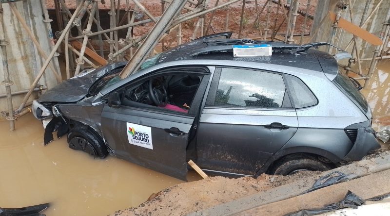 Motorista perde controle da direção e carro cai em canteiro de obras na região do Acesso Norte.