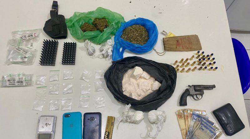 Após o relato, os policiais foram para o local indicado, onde um dos suspeitos tentou fugir, mas foi rapidamente detido ao entrar em um imóvel. No local, a polícia encontrou outros dois suspeitos e diversos materiais, incluindo um revólver calibre .32, munições de diferentes calibres, drogas, balança de precisão, aparelhos celulares e dinheiro.