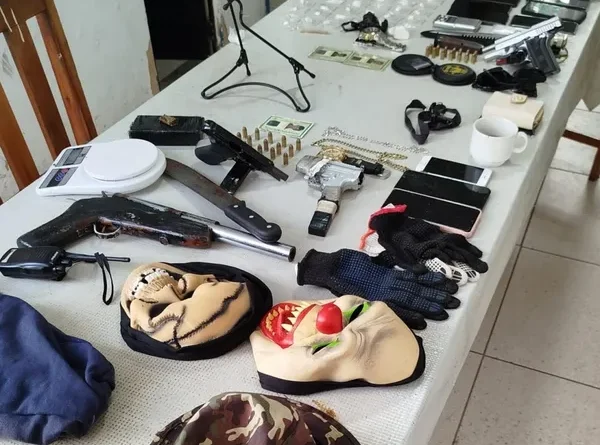 Na abordagem, os policiais encontraram com o grupo duas pistolas, uma espingarda, uma arma falsa, além de balaclavas, máscaras usadas em crimes, rádio comunicador, munições, nove celulares, dinheiro em espécie, e balanças de precisão. Também foram apreendidas 37 porções de cocaína, um tablete da mesma substância e maconha.