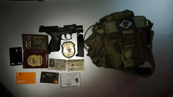 Durante a revista, foram encontrados uma réplica de pistola, três identidades funcionais de instituições diferentes falsas, uma Carteira Nacional de Habilitação com o nome de outra pessoa, uma carteira com brasão e um distintivo.