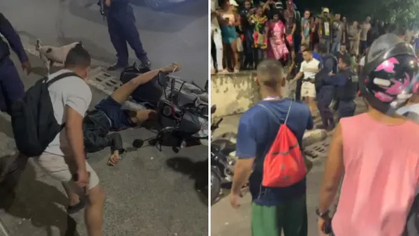 Vídeos gravados por mototaxistas que estavam no local mostram o momento em que o suspeito aparece caído no meio-fio, ao lado da motocicleta usada na ação criminosa.