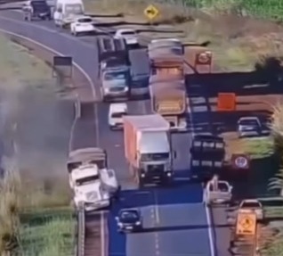 Nas imagens, é possível ver um carro branco tentando ultrapassar diversos veículos pela contramão. No meio da curva, uma carreta surge no sentido oposto e, para evitar uma colisão frontal, o caminhoneiro precisa jogar o veículo para fora da pista, atingindo o guard-rail. O motorista do carro pequeno foge pelo acostamento, deixando prejuízos materiais ao condutor da carreta.