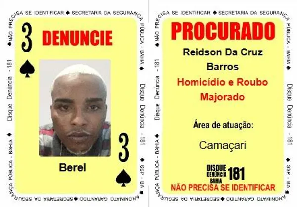 Reidson da Cruz Barros, conhecido como ‘Berel’, é o novo integrante do Baralho do Crime da Secretaria da Segurança Pública da Bahia (SSP-BA). Ele passou a ocupar a carta 3 de Espadas da ferramenta na manhã desta quinta-feira (7).