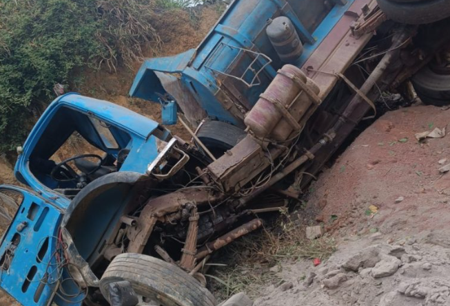 Um caminhão-caçamba tombou na manhã deste sábado (13) em uma estrada vicinal do município de Jaguaquara, no Vale do Jiquiriçá, resultando em ferimentos no motorista.