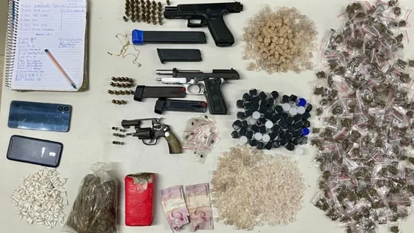 Na ocorrência, foram apreendidas três armas de fogo, incluindo pistolas calibres 9mm e .40, além de um revólver calibre .32, carregadores e munições. Também foram recolhidos entorpecentes, como cocaína, maconha, crack e haxixe, além de celulares, mochilas, dinheiro em espécie e um caderno com anotações relacionadas ao tráfico de drogas.