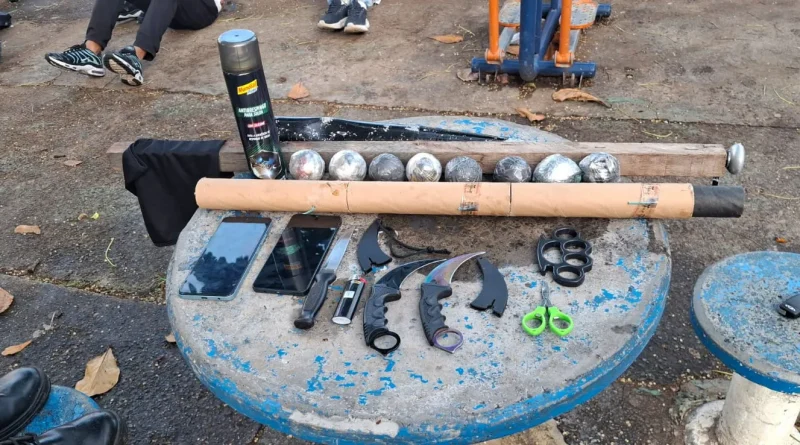 Ao receberem a denúncia, os agentes foram até o local onde os suspeitos tentaram fugir. No entanto, eles foram alcançados pelos pms. Na ação foram apreendidas oito bombas caseiras, quatro facas, dois porretes, um taco de beisebol, uma soqueira, foguete e máscaras.